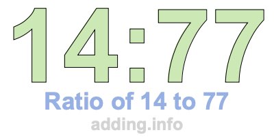 A ratio of 14 to 77 can be written as 14 to 77, 14:77, or 14/77. Furthermore, 14 and 77 can be the quantity or measurement of anything, such as students, fruit, weights, heights, speed and so on.
