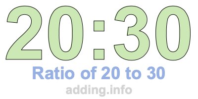 A ratio of 20 to 30 can be written as 20 to 30, 20:30, or 20/30. Furthermore, 20 and 30 can be the quantity or measurement of anything, such as students, fruit, weights, heights, speed and so on.