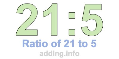 A ratio of 21 to 5 can be written as 21 to 5, 21:5, or 21/5. Furthermore, 21 and 5 can be the quantity or measurement of anything, such as students, fruit, weights, heights, speed and so on.