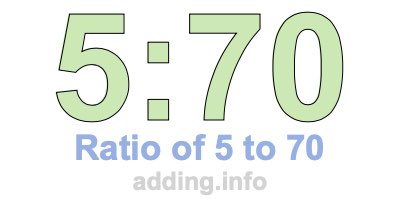 A ratio of 5 to 70 can be written as 5 to 70, 5:70, or 5/70. Furthermore, 5 and 70 can be the quantity or measurement of anything, such as students, fruit, weights, heights, speed and so on.