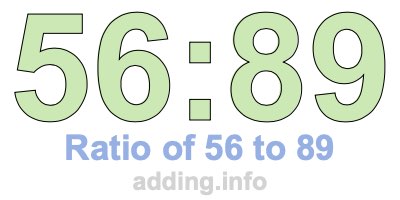 A ratio of 56 to 89 can be written as 56 to 89, 56:89, or 56/89. Furthermore, 56 and 89 can be the quantity or measurement of anything, such as students, fruit, weights, heights, speed and so on.