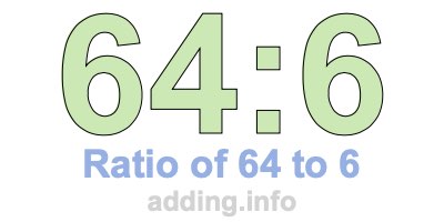 A ratio of 64 to 6 can be written as 64 to 6, 64:6, or 64/6. Furthermore, 64 and 6 can be the quantity or measurement of anything, such as students, fruit, weights, heights, speed and so on.