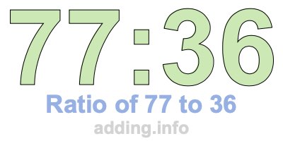 A ratio of 77 to 36 can be written as 77 to 36, 77:36, or 77/36. Furthermore, 77 and 36 can be the quantity or measurement of anything, such as students, fruit, weights, heights, speed and so on.