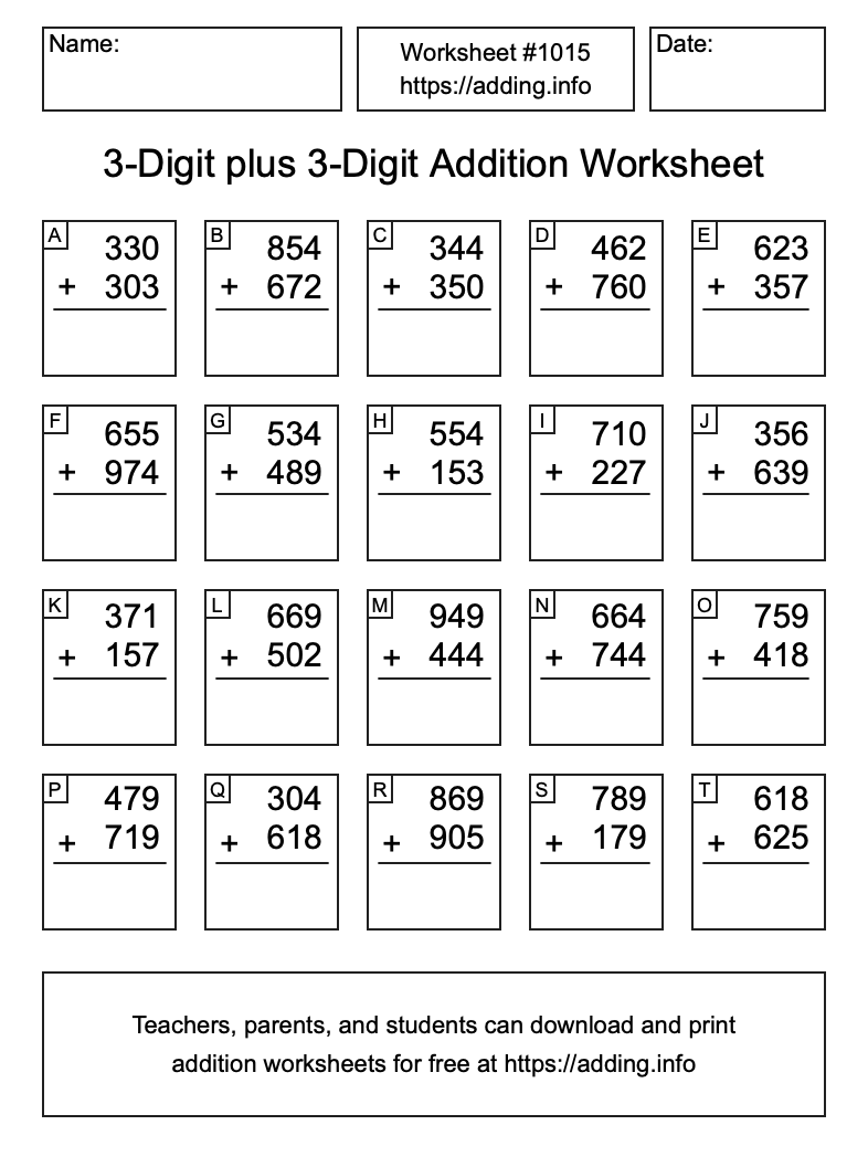 Here is the 3-Digit plus 3-Digit Addition Worksheet #1015. Print and/or save the worksheet using the buttons below the image. You can also drag or right-click on the image to download it to your device.