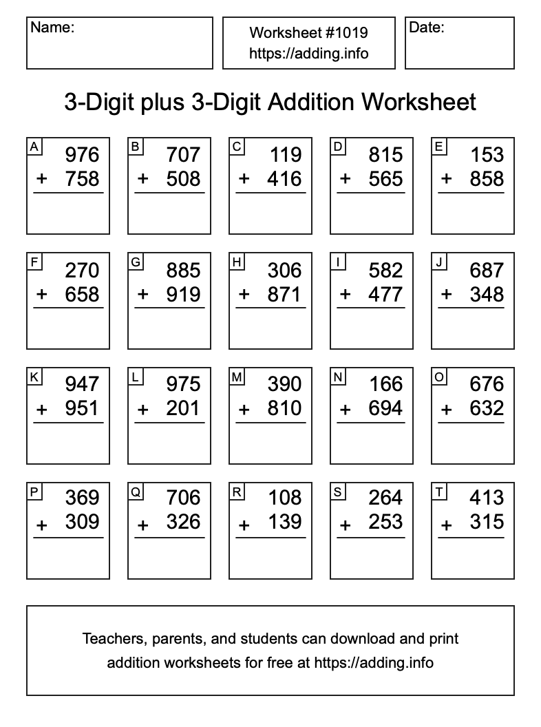 Here is the 3-Digit plus 3-Digit Addition Worksheet #1019. Print and/or save the worksheet using the buttons below the image. You can also drag or right-click on the image to download it to your device.