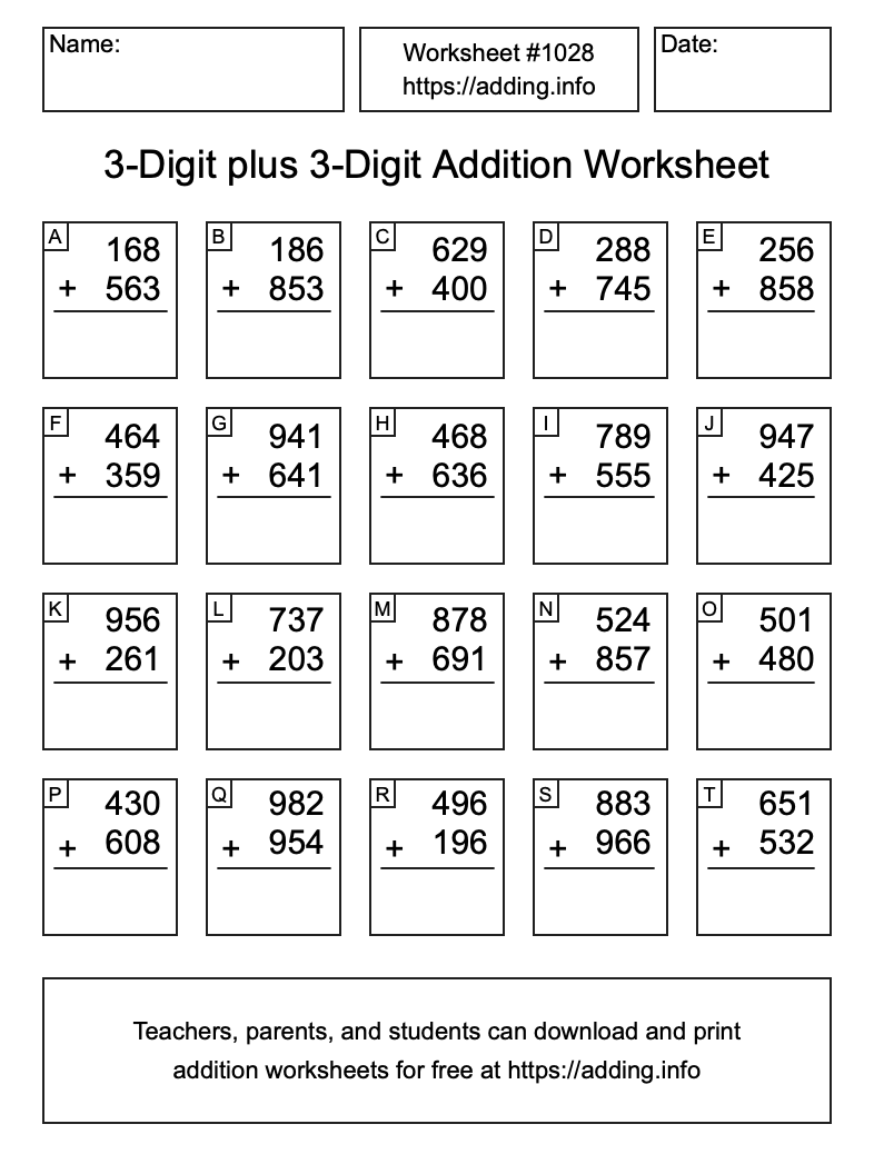 Here is the 3-Digit plus 3-Digit Addition Worksheet #1028. Print and/or save the worksheet using the buttons below the image. You can also drag or right-click on the image to download it to your device.