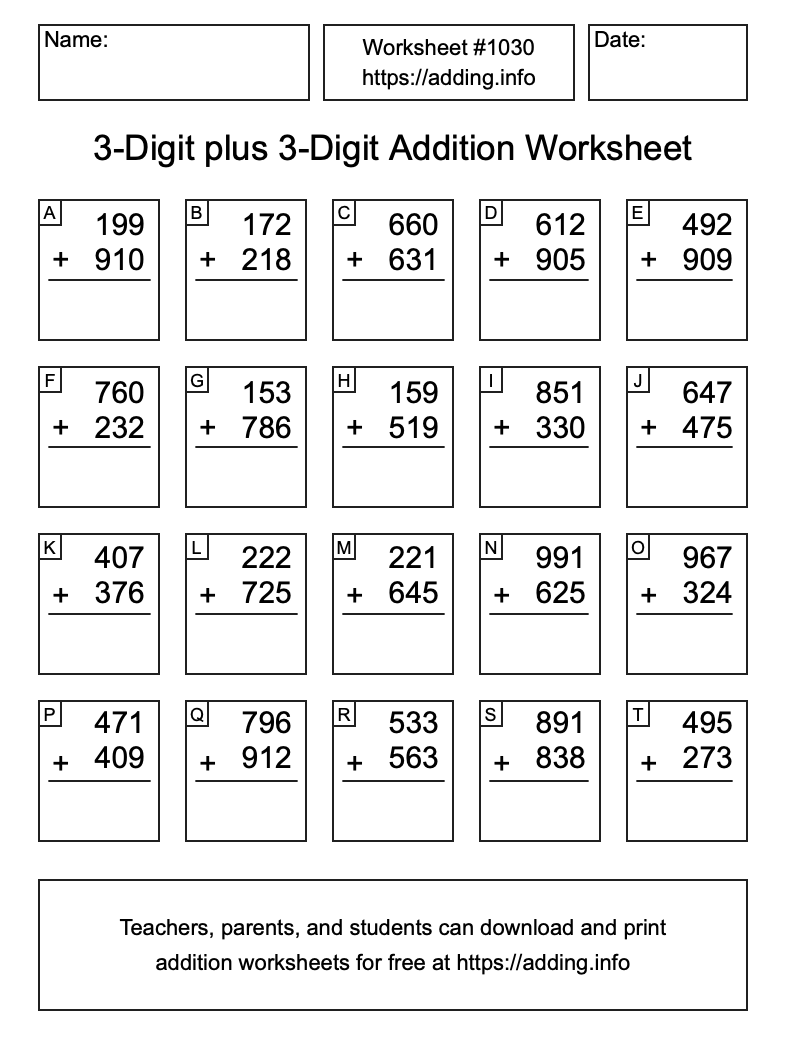 Here is the 3-Digit plus 3-Digit Addition Worksheet #1030. Print and/or save the worksheet using the buttons below the image. You can also drag or right-click on the image to download it to your device.