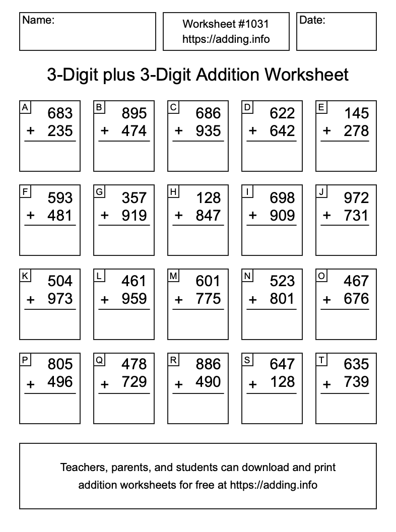 Here is the 3-Digit plus 3-Digit Addition Worksheet #1031. Print and/or save the worksheet using the buttons below the image. You can also drag or right-click on the image to download it to your device.