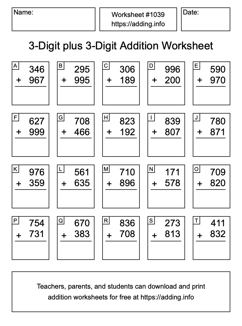 Here is the 3-Digit plus 3-Digit Addition Worksheet #1039. Print and/or save the worksheet using the buttons below the image. You can also drag or right-click on the image to download it to your device.