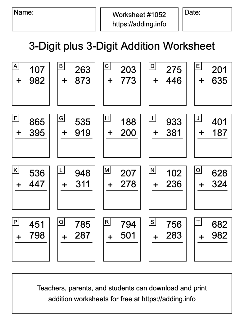Here is the 3-Digit plus 3-Digit Addition Worksheet #1052. Print and/or save the worksheet using the buttons below the image. You can also drag or right-click on the image to download it to your device.