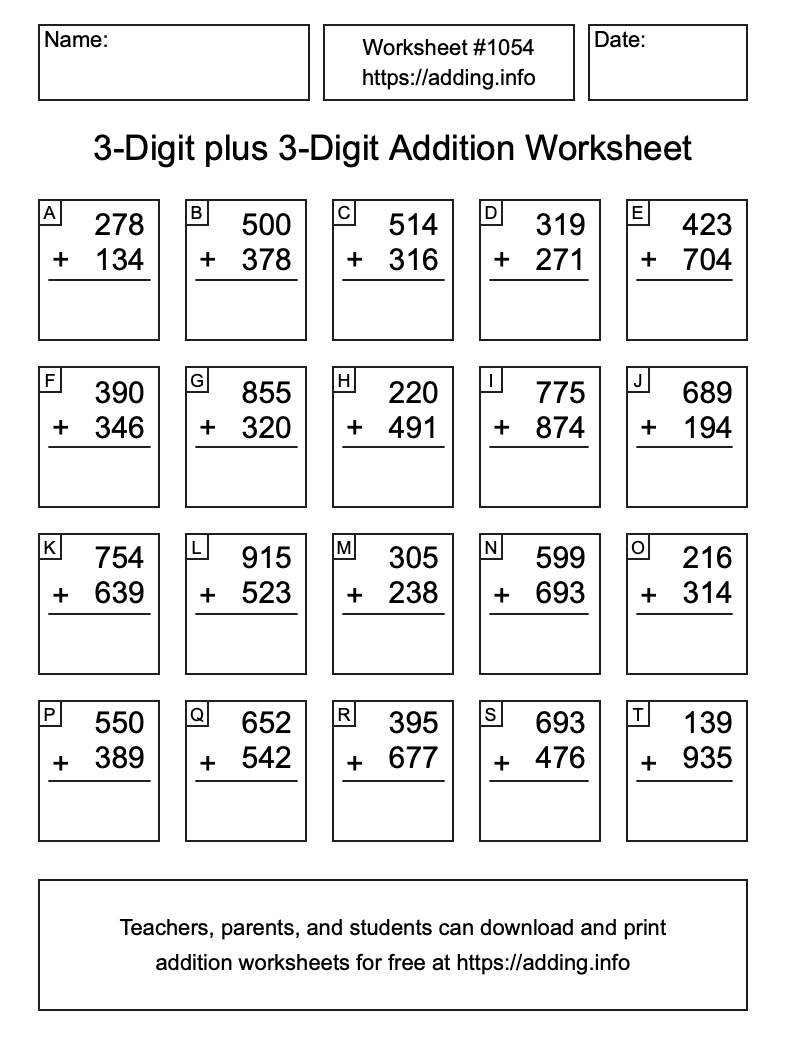 Here is the 3-Digit plus 3-Digit Addition Worksheet #1054. Print and/or save the worksheet using the buttons below the image. You can also drag or right-click on the image to download it to your device.