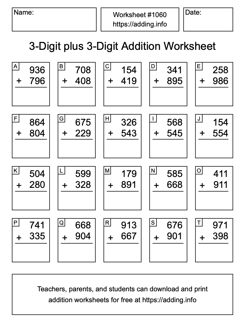 Here is the 3-Digit plus 3-Digit Addition Worksheet #1060. Print and/or save the worksheet using the buttons below the image. You can also drag or right-click on the image to download it to your device.