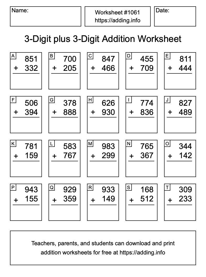 Here is the 3-Digit plus 3-Digit Addition Worksheet #1061. Print and/or save the worksheet using the buttons below the image. You can also drag or right-click on the image to download it to your device.