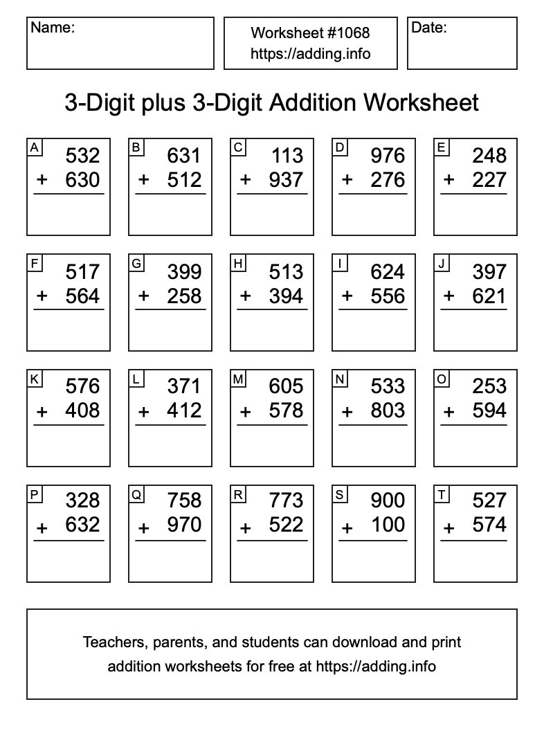 Here is the 3-Digit plus 3-Digit Addition Worksheet #1068. Print and/or save the worksheet using the buttons below the image. You can also drag or right-click on the image to download it to your device.