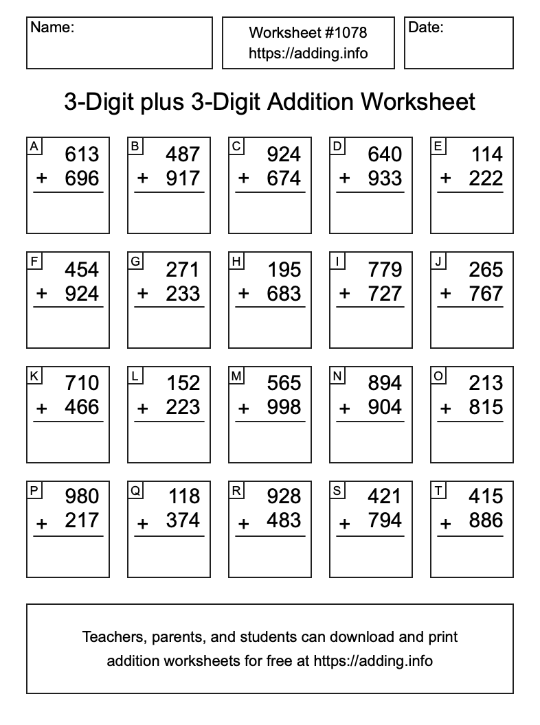 Here is the 3-Digit plus 3-Digit Addition Worksheet #1078. Print and/or save the worksheet using the buttons below the image. You can also drag or right-click on the image to download it to your device.