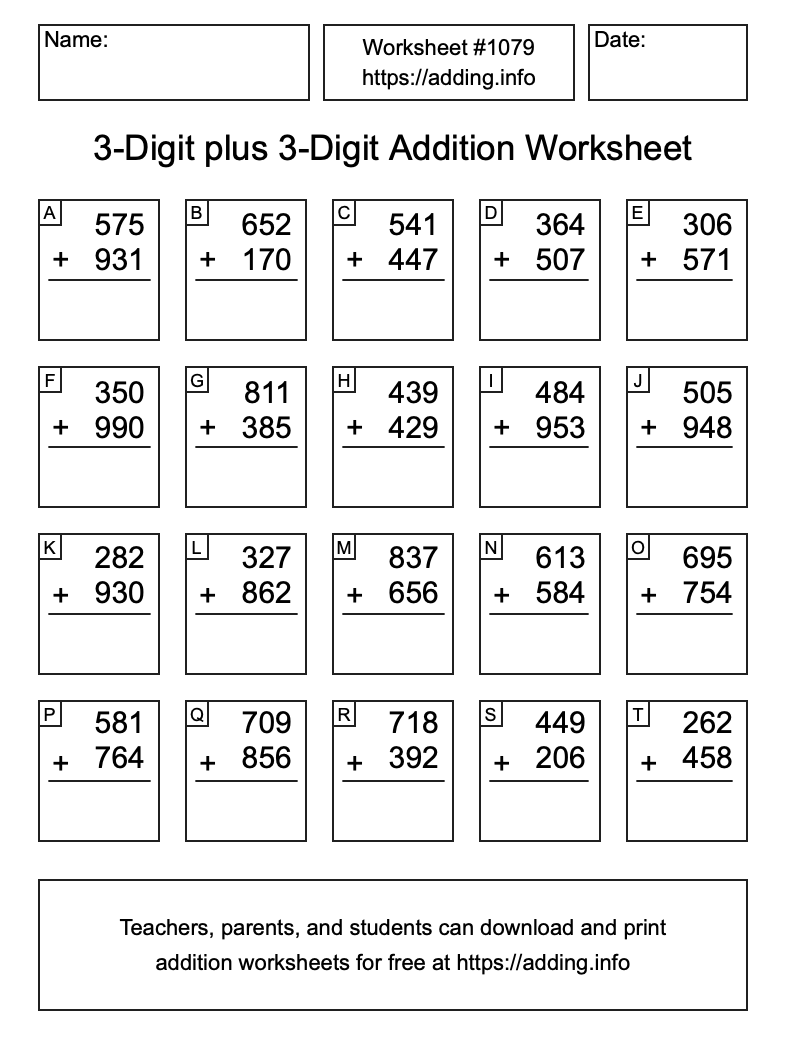 Here is the 3-Digit plus 3-Digit Addition Worksheet #1079. Print and/or save the worksheet using the buttons below the image. You can also drag or right-click on the image to download it to your device.
