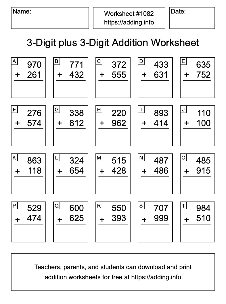 Here is the 3-Digit plus 3-Digit Addition Worksheet #1082. Print and/or save the worksheet using the buttons below the image. You can also drag or right-click on the image to download it to your device.