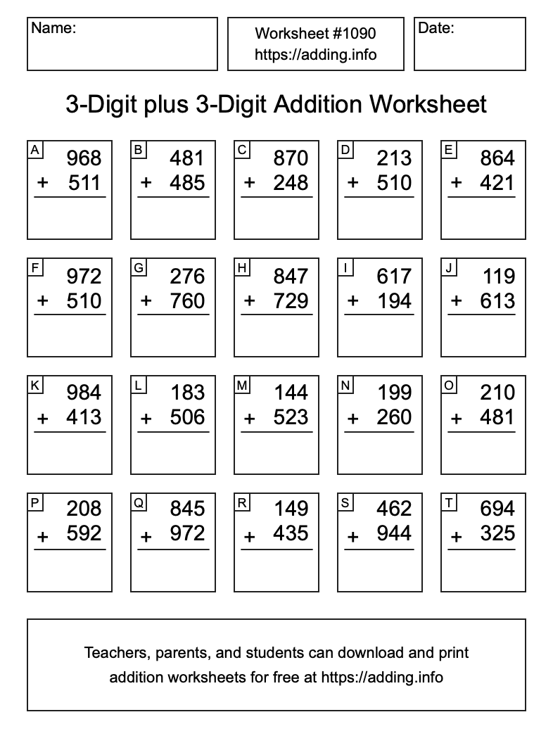 Here is the 3-Digit plus 3-Digit Addition Worksheet #1090. Print and/or save the worksheet using the buttons below the image. You can also drag or right-click on the image to download it to your device.