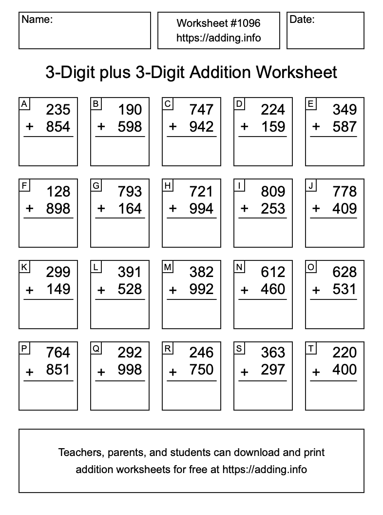 Here is the 3-Digit plus 3-Digit Addition Worksheet #1096. Print and/or save the worksheet using the buttons below the image. You can also drag or right-click on the image to download it to your device.
