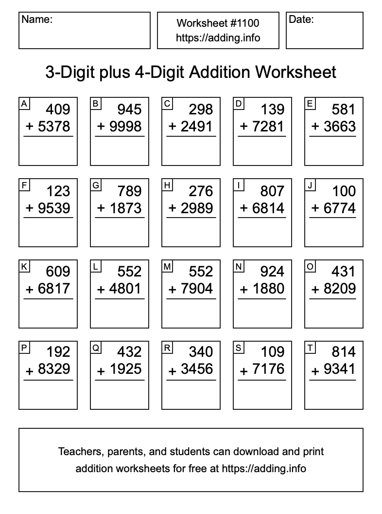 Here is the 3-Digit plus 4-Digit Addition Worksheet #1100. Print and/or save the worksheet using the buttons below the image. You can also drag or right-click on the image to download it to your device.