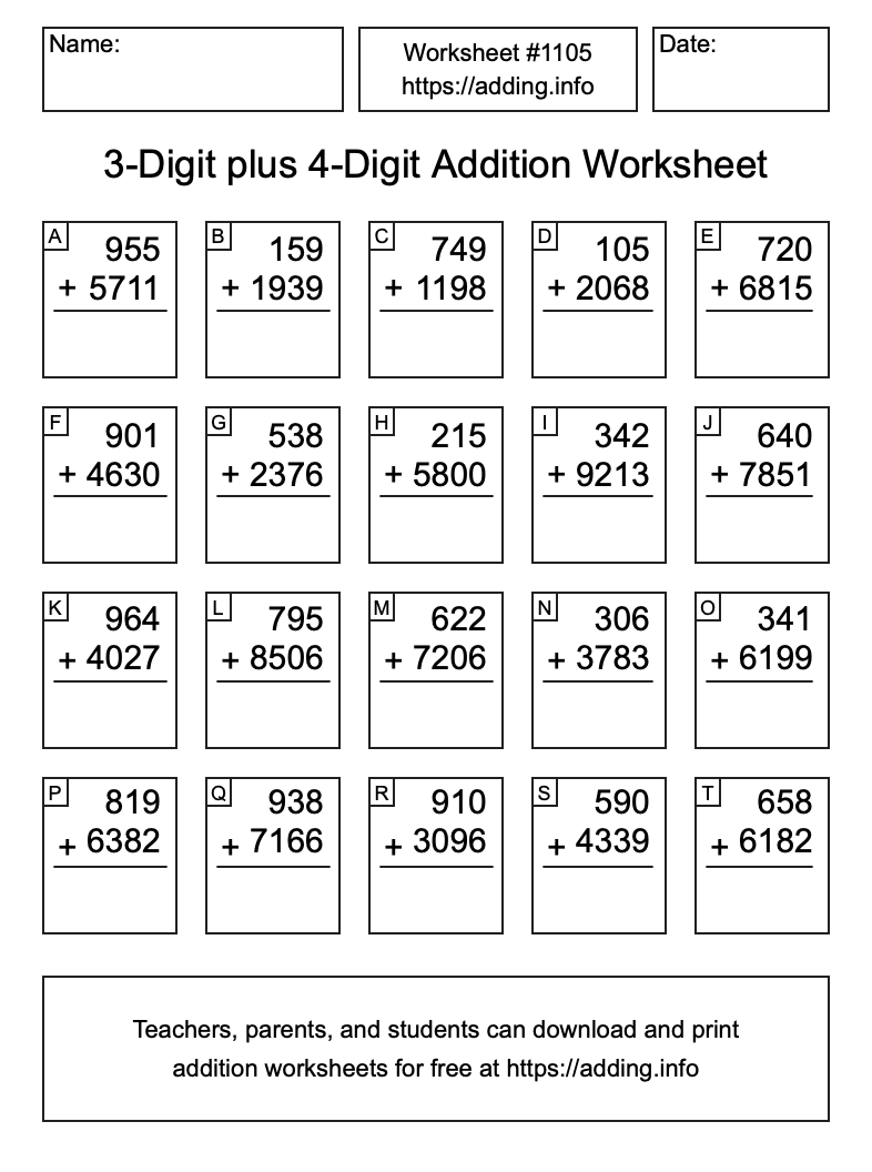Here is the 3-Digit plus 4-Digit Addition Worksheet #1105. Print and/or save the worksheet using the buttons below the image. You can also drag or right-click on the image to download it to your device.
