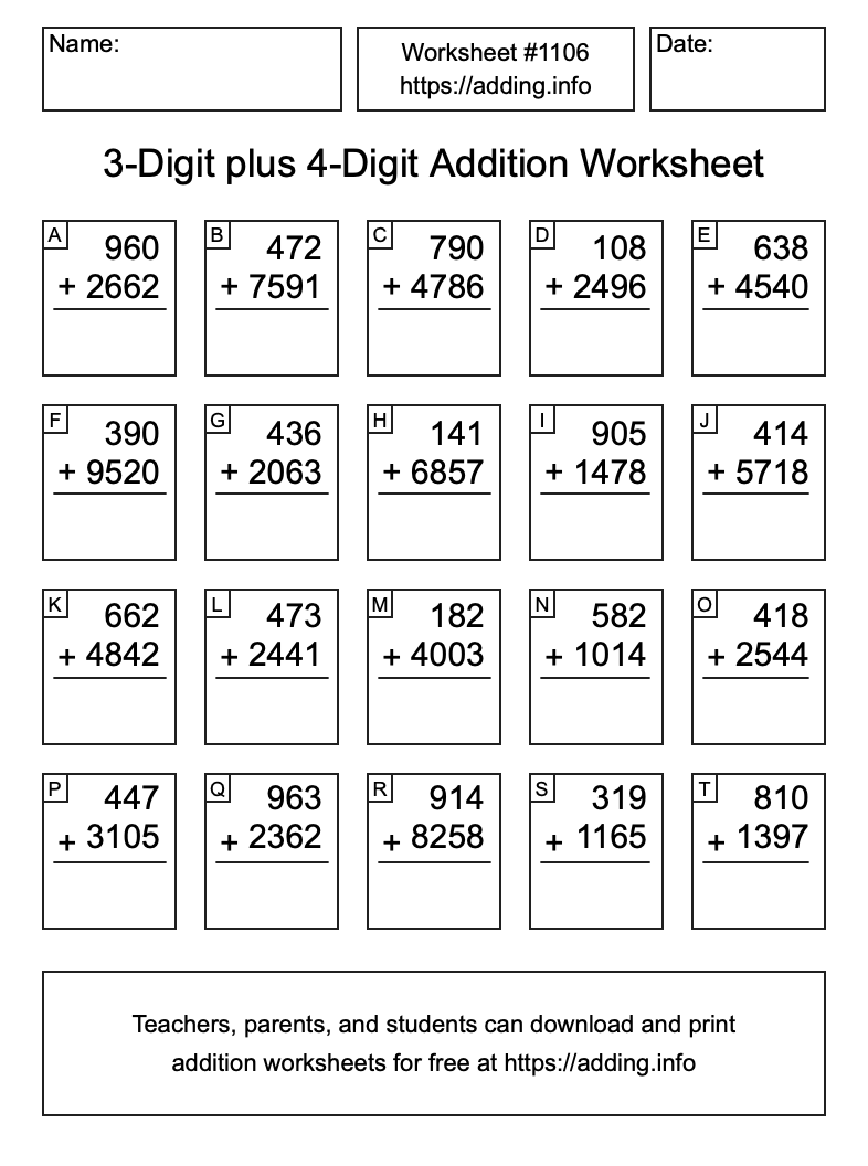 Here is the 3-Digit plus 4-Digit Addition Worksheet #1106. Print and/or save the worksheet using the buttons below the image. You can also drag or right-click on the image to download it to your device.