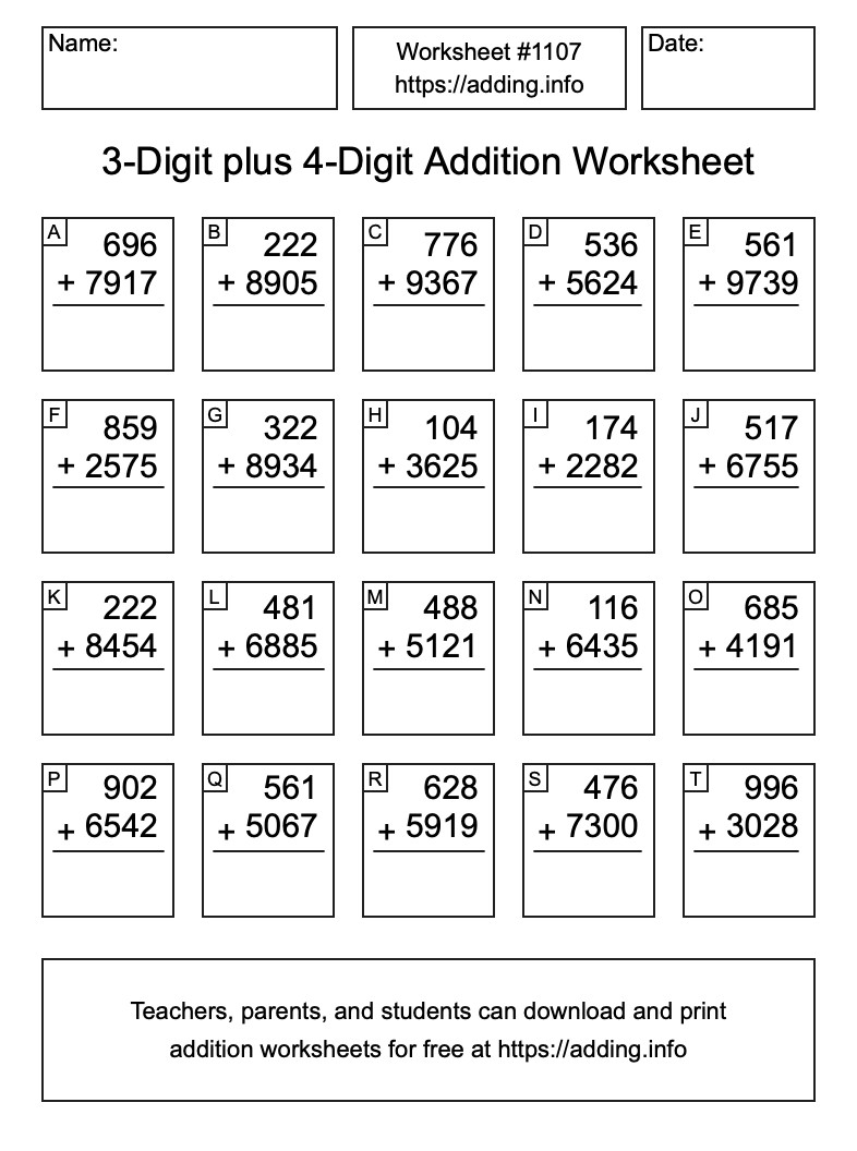 Here is the 3-Digit plus 4-Digit Addition Worksheet #1107. Print and/or save the worksheet using the buttons below the image. You can also drag or right-click on the image to download it to your device.