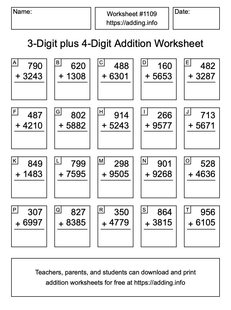 Here is the 3-Digit plus 4-Digit Addition Worksheet #1109. Print and/or save the worksheet using the buttons below the image. You can also drag or right-click on the image to download it to your device.