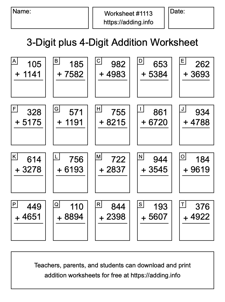Here is the 3-Digit plus 4-Digit Addition Worksheet #1113. Print and/or save the worksheet using the buttons below the image. You can also drag or right-click on the image to download it to your device.