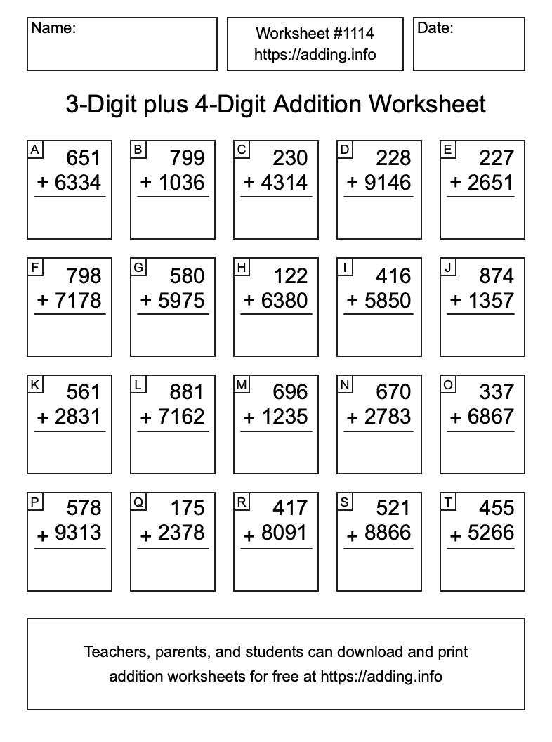 Here is the 3-Digit plus 4-Digit Addition Worksheet #1114. Print and/or save the worksheet using the buttons below the image. You can also drag or right-click on the image to download it to your device.