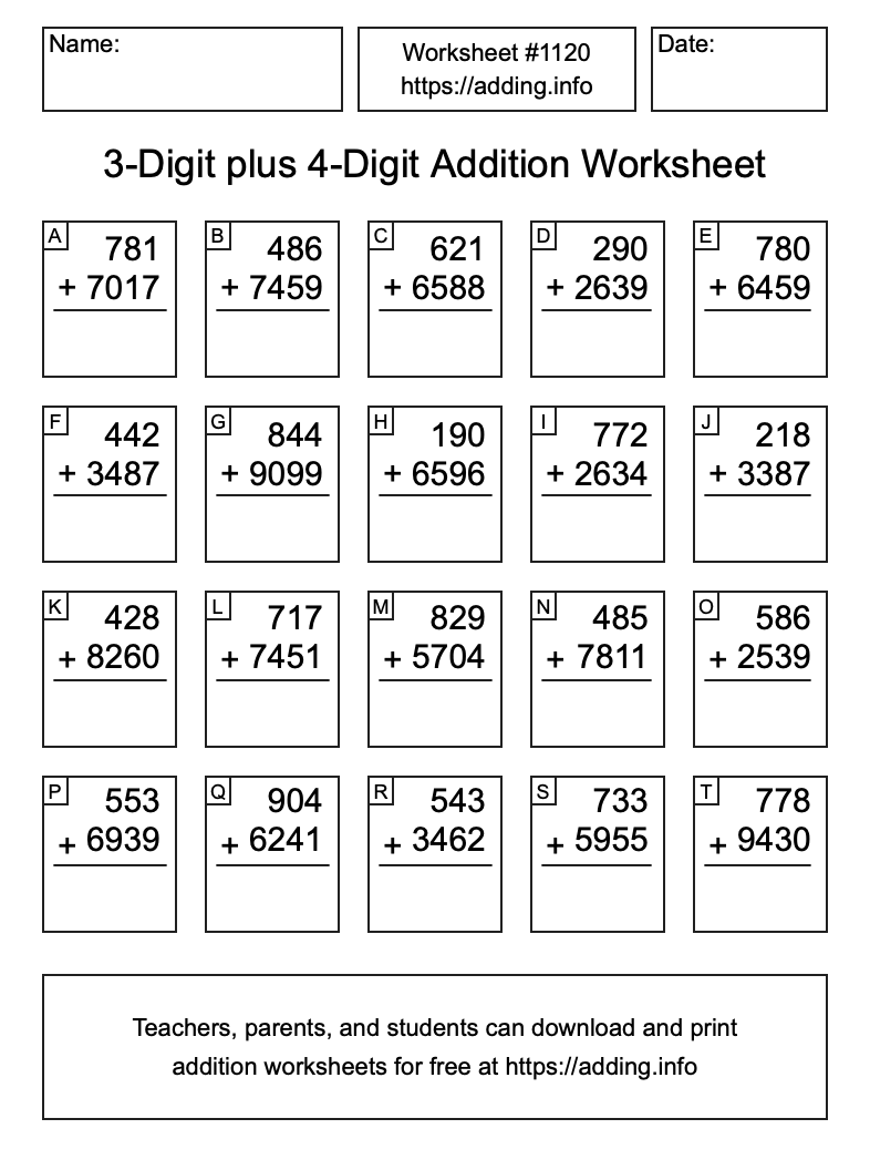 Here is the 3-Digit plus 4-Digit Addition Worksheet #1120. Print and/or save the worksheet using the buttons below the image. You can also drag or right-click on the image to download it to your device.