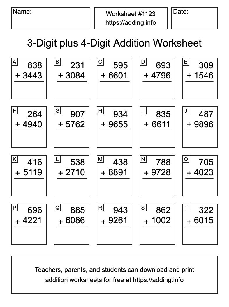 Here is the 3-Digit plus 4-Digit Addition Worksheet #1123. Print and/or save the worksheet using the buttons below the image. You can also drag or right-click on the image to download it to your device.