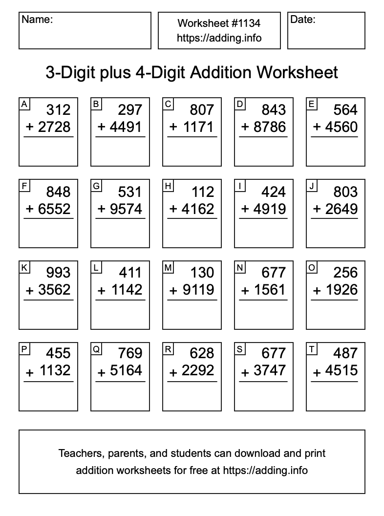 Here is the 3-Digit plus 4-Digit Addition Worksheet #1134. Print and/or save the worksheet using the buttons below the image. You can also drag or right-click on the image to download it to your device.