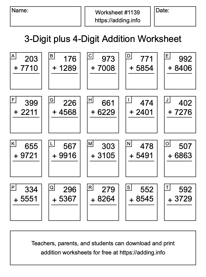 Here is the 3-Digit plus 4-Digit Addition Worksheet #1139. Print and/or save the worksheet using the buttons below the image. You can also drag or right-click on the image to download it to your device.