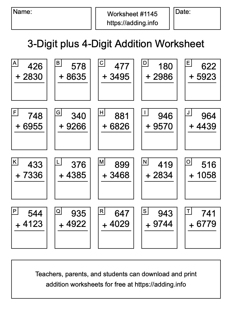 Here is the 3-Digit plus 4-Digit Addition Worksheet #1145. Print and/or save the worksheet using the buttons below the image. You can also drag or right-click on the image to download it to your device.