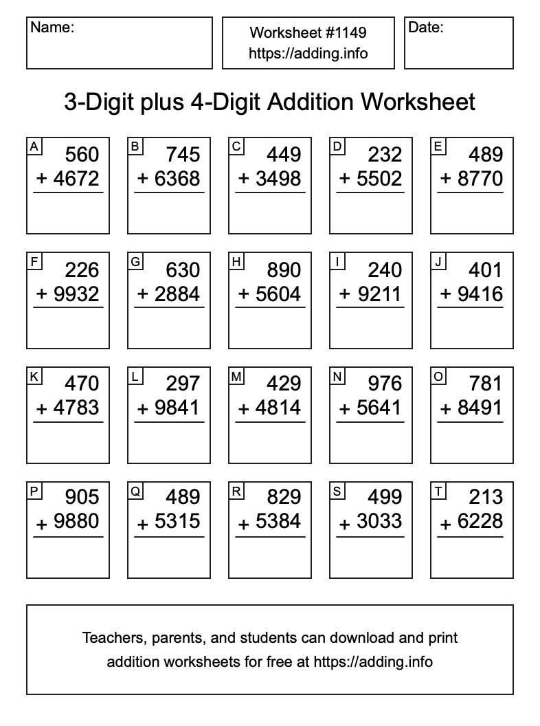 Here is the 3-Digit plus 4-Digit Addition Worksheet #1149. Print and/or save the worksheet using the buttons below the image. You can also drag or right-click on the image to download it to your device.
