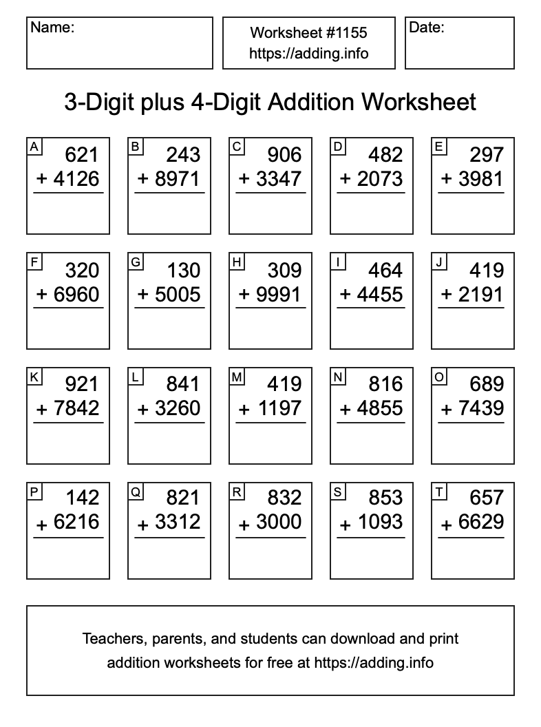 Here is the 3-Digit plus 4-Digit Addition Worksheet #1155. Print and/or save the worksheet using the buttons below the image. You can also drag or right-click on the image to download it to your device.
