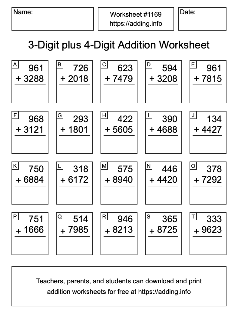 Here is the 3-Digit plus 4-Digit Addition Worksheet #1169. Print and/or save the worksheet using the buttons below the image. You can also drag or right-click on the image to download it to your device.