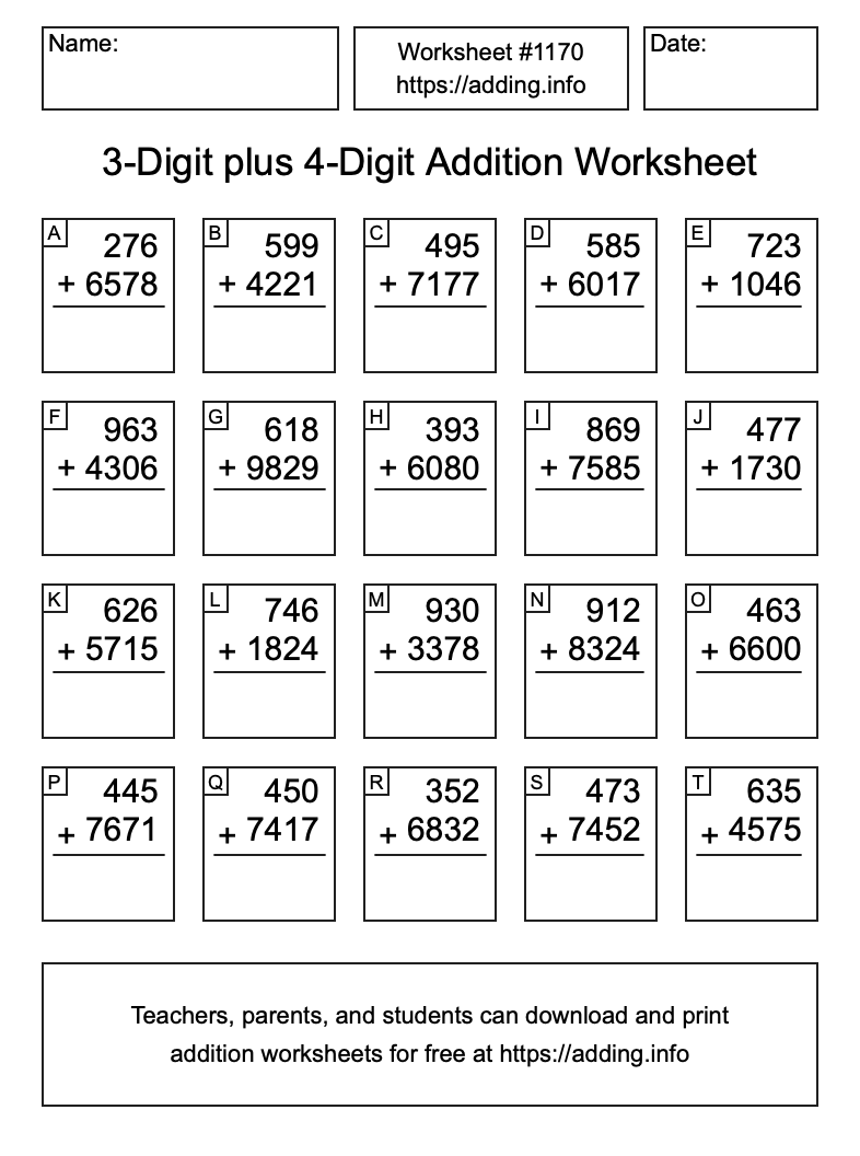 Here is the 3-Digit plus 4-Digit Addition Worksheet #1170. Print and/or save the worksheet using the buttons below the image. You can also drag or right-click on the image to download it to your device.