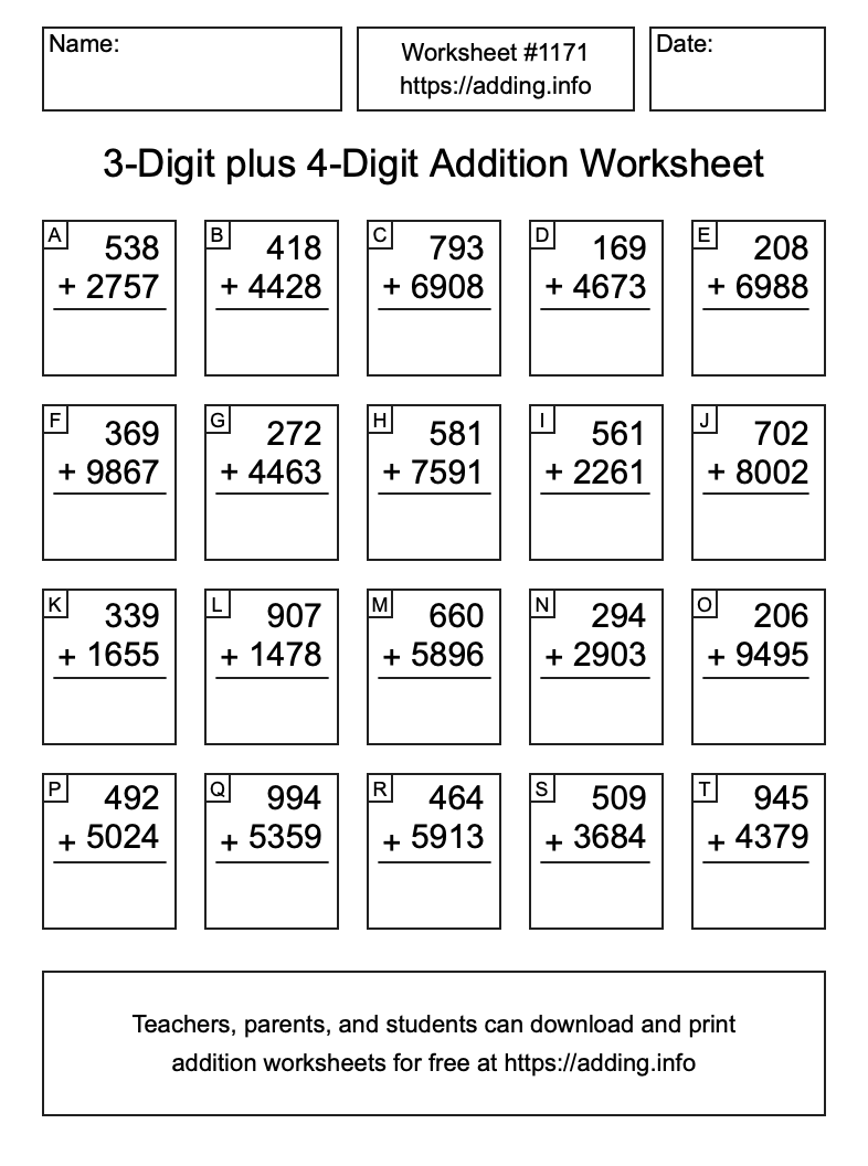 Here is the 3-Digit plus 4-Digit Addition Worksheet #1171. Print and/or save the worksheet using the buttons below the image. You can also drag or right-click on the image to download it to your device.