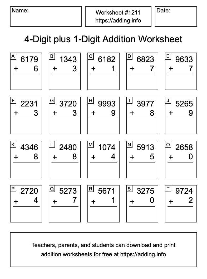 Here is the 4-Digit plus 1-Digit Addition Worksheet #1211. Print and/or save the worksheet using the buttons below the image. You can also drag or right-click on the image to download it to your device.