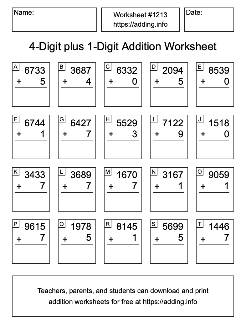 Here is the 4-Digit plus 1-Digit Addition Worksheet #1213. Print and/or save the worksheet using the buttons below the image. You can also drag or right-click on the image to download it to your device.