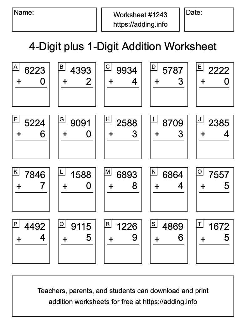 Here is the 4-Digit plus 1-Digit Addition Worksheet #1243. Print and/or save the worksheet using the buttons below the image. You can also drag or right-click on the image to download it to your device.