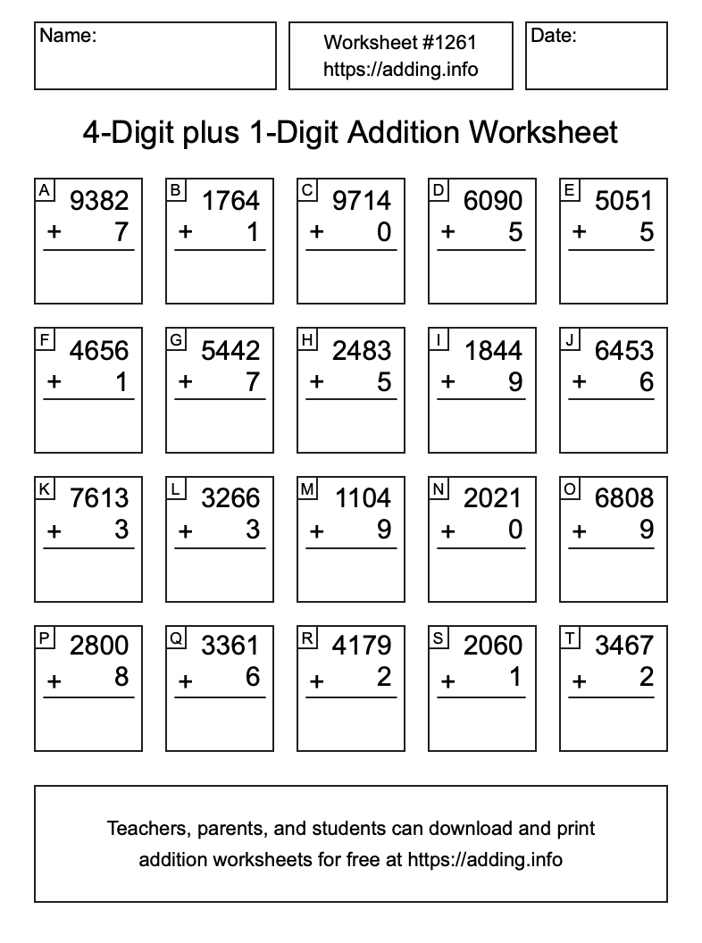 Here is the 4-Digit plus 1-Digit Addition Worksheet #1261. Print and/or save the worksheet using the buttons below the image. You can also drag or right-click on the image to download it to your device.