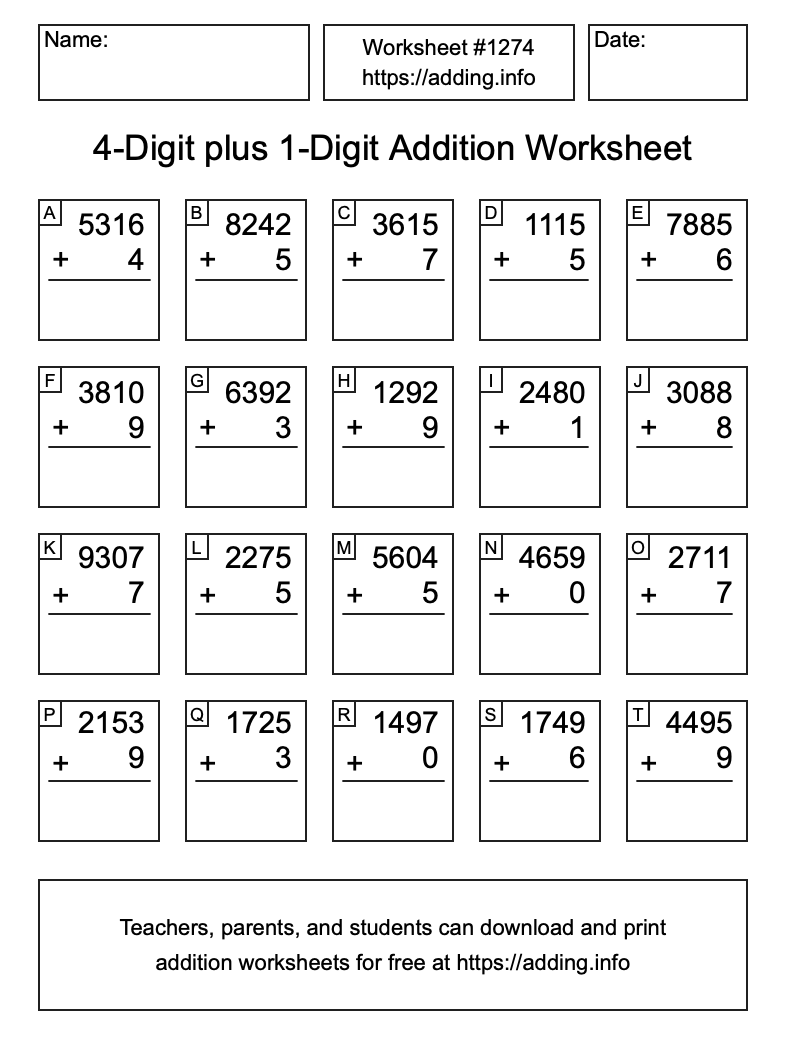 Here is the 4-Digit plus 1-Digit Addition Worksheet #1274. Print and/or save the worksheet using the buttons below the image. You can also drag or right-click on the image to download it to your device.