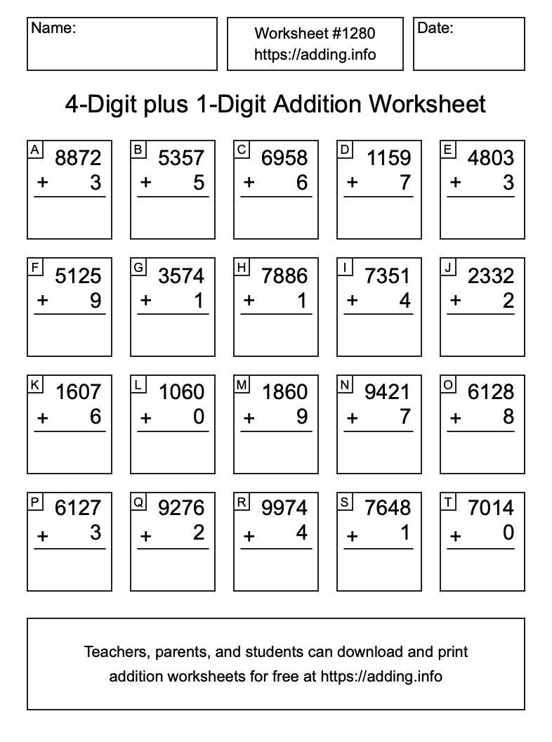 Here is the 4-Digit plus 1-Digit Addition Worksheet #1280. Print and/or save the worksheet using the buttons below the image. You can also drag or right-click on the image to download it to your device.
