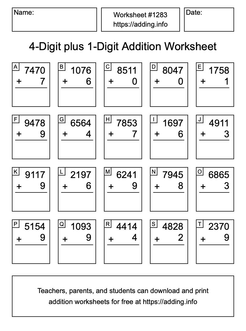 Here is the 4-Digit plus 1-Digit Addition Worksheet #1283. Print and/or save the worksheet using the buttons below the image. You can also drag or right-click on the image to download it to your device.