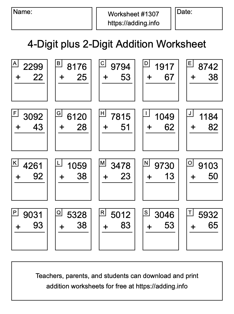 Here is the 4-Digit plus 2-Digit Addition Worksheet #1307. Print and/or save the worksheet using the buttons below the image. You can also drag or right-click on the image to download it to your device.