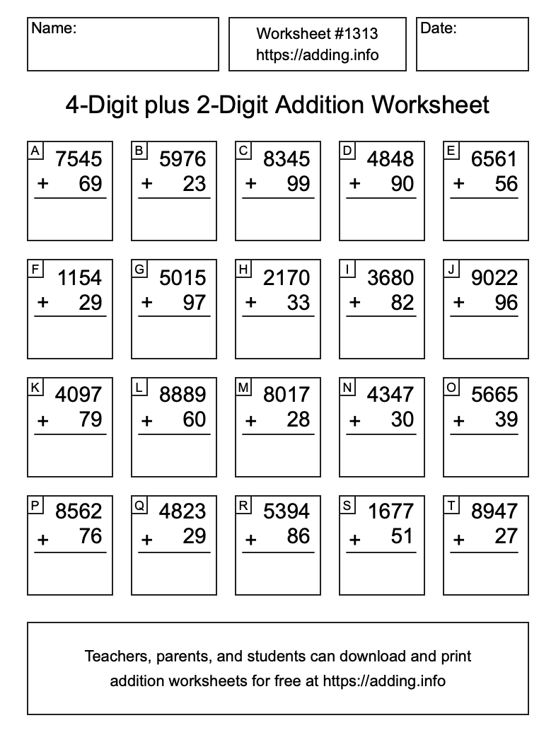 Here is the 4-Digit plus 2-Digit Addition Worksheet #1313. Print and/or save the worksheet using the buttons below the image. You can also drag or right-click on the image to download it to your device.