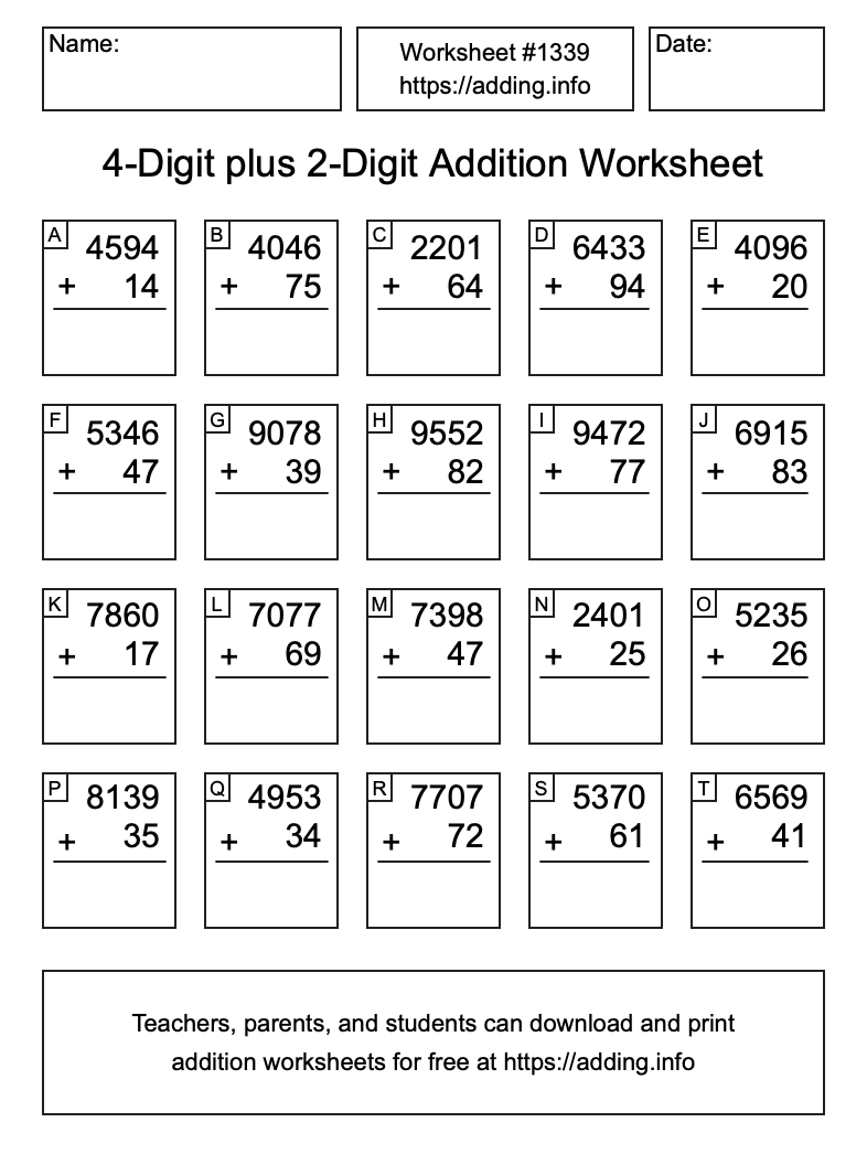 Here is the 4-Digit plus 2-Digit Addition Worksheet #1339. Print and/or save the worksheet using the buttons below the image. You can also drag or right-click on the image to download it to your device.